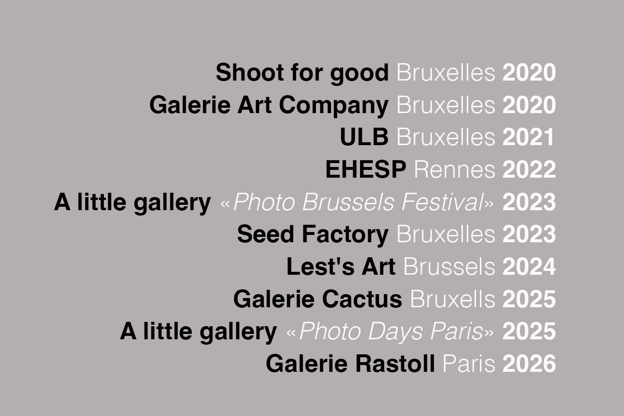 2015 - Galerie Guillaume - Paris. / 2015 - Conférence Recyclart Brussels. / 2013 - "Continents Insolites" - Brussels. / 2013 - BIP (Brussels Info Place) / 2013 - Les ascensionnelles - Corse / 2012 - Galerie Johanne Riss - Bruxelles / 2012 - "Rockabilly a way of life" - Brussels.